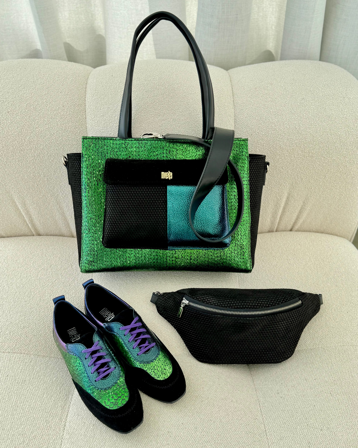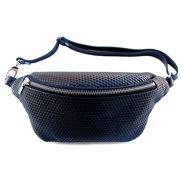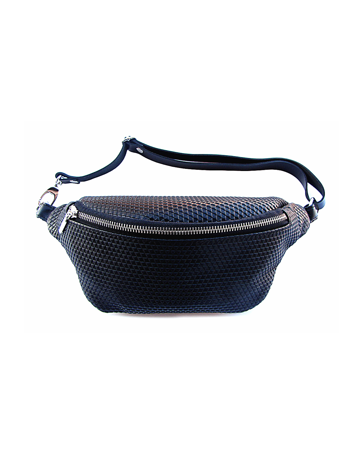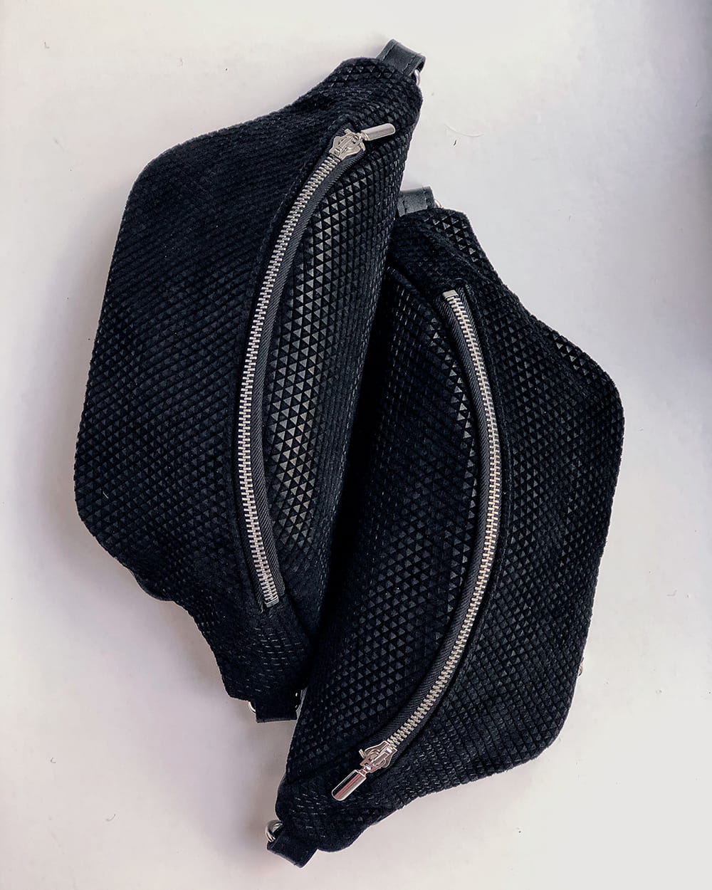 Ledvinka, pouzdro na opasek – celé vyrobené z přírodní kůže. Dominantní barvou tohoto modelu je semišová černá s geometrickým 3D vzorem v podobě malých trojúhelníků.