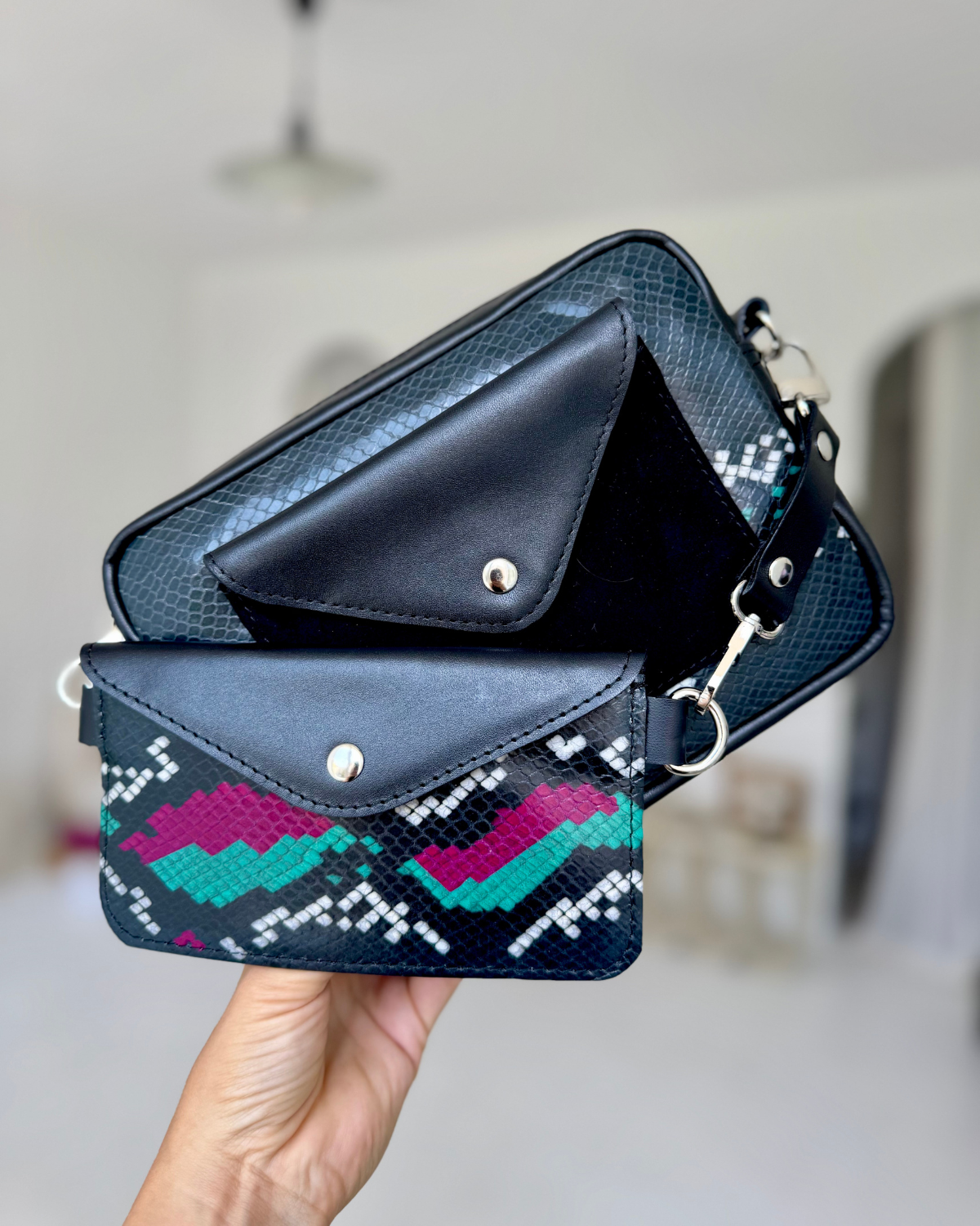 Dvojitá kabelka se skládá ze dvou spojených částí (velké a malé), které lze nosit společně anebo samostatně. Jsou to vlastně dvě tašky v jedné. Vejdou se do ní užitečné drobné předměty, zápisník formátu A5, kniha, tablet a dokonce i malý deštník. Je vybavena dvěma kapsami – vnější uzavíratelnou na magnet a vnitřní uzavíratelnou na zip.