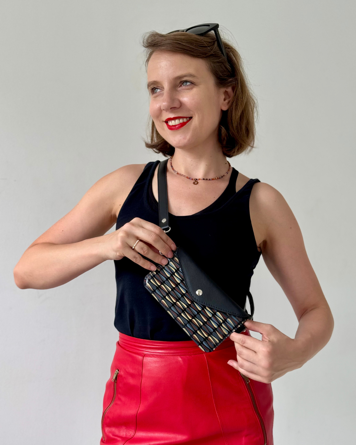 Lze ji nosit buď na rameni, nebo zešikma jako klasickou kabelku, ale může sloužit i jako elegantní pouzdro na opasek, do kterého se vejde telefon nebo platební karta.